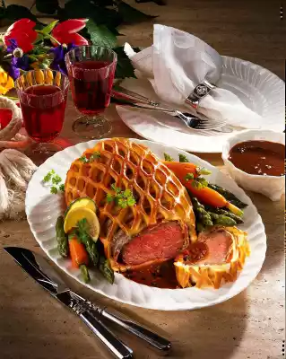 Roll out the dough on a floured base to a rectangle (approx. 23 x 27 cm). Score with a cake grid cutter. Place the dough around the roast, pulling slightly apart. Place on a baking tray lined with baking paper. Bake in a preheated oven (electric: 200 °C/ gas: level 3) for about 25 minutes. Cover with aluminium foil and roast for another 10-15 minutes. In the meantime, peel and finely chop the shallots. Heat the fat. Steam shallots in it at medium heat for about 5 minutes. Deglaze with white wine. Let it boil down for 5 minutes at high heat. Add peppercorns and beef stock. Cook for about 20 minutes at high heat.