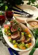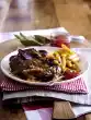 Season to taste with a little salt. Peel the carrots so that some green remains. Cut off the asparagus ends briefly. Cut the asparagus in half. Cook carrots in boiling salted water for about 15 minutes, asparagus for 10-15 minutes. Serve the roast, vegetables and sauce garnished with chervil and lime wheels
