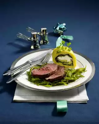 Add the polenta and spread it out into a rectangle (27 x 24 cm). Spread spinach on top. Sprinkle chestnuts over it. Cut the goat cheese into cubes of approx. 1 x 1 cm. Spread the cheese in a line in the middle of the polenta. Roll up very carefully and press into a roll. Wash the fillet, dab dry. Heat 2 tablespoons of oil in a frying pan and fry the meat well all around. Season with salt and pepper. Place on the fat pan of the oven and bake in the preheated oven (electric cooker: 175 °C/ convection oven: 150 °C/ gas: level 2) for approx. 30 minutes. After 15 minutes, place the polenta roll on the fat pan and warm it up. In the meantime, clean and wash the sugar snap peas and cut them into fine strips. Heat 25 butter in a frying pan, add sugar snap peas and steam for 6-8 minutes at low heat.