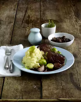 Arrange puree, Brussels sprouts, meat and onions on preheated plates.
