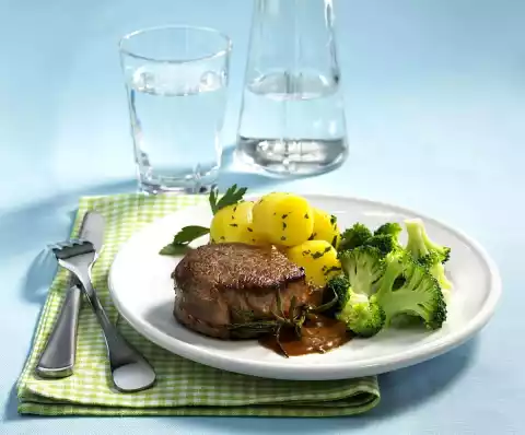 Peel and wash the potatoes, possibly cut in half and cook for about 20 minutes in boiling salted water. Meanwhile clean the broccoli and divide into florets. Cook in 400 ml salted water for 5-8 minutes. Wash the fillet, dab dry and tie in shape with kitchen string. Put 1 sprig of rosemary under each yarn.