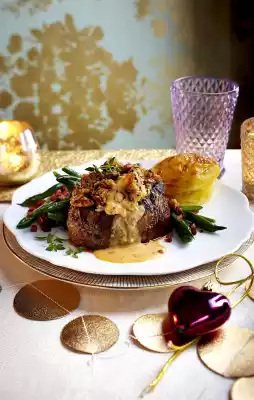Melt 1 teaspoon butter in a frying pan. Skip the bacon and fry the onions. Add beans and 2 tablespoons of water, steam for about 5 minutes at medium heat, season with salt and pepper. Take meat out of the oven, let it rest for about 10 minutes.