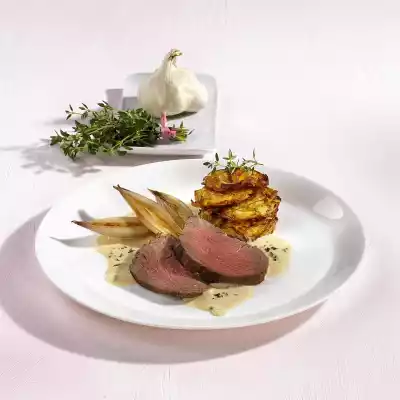 Season sauce with salt and pepper. Cut beef fillet into approx. 8 slices. Arrange fillets with sauce, shallots and rösti. Garnish with thyme stems.