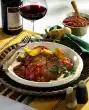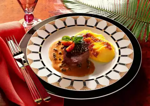 Arrange steak with sauce and gratin on plates. Garnish as desired with herbs and tomato wedges.