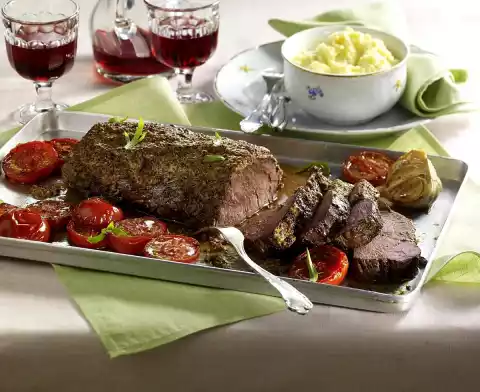 Sear the beef fillet on all sides. Add tomatoes and garlic, also fry. Put meat, tomatoes and garlic on the preheated baking tray. Spread the fillet with the mustard cream. Season tomatoes with salt.