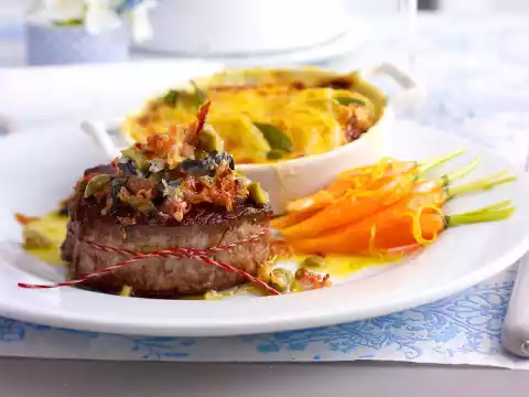 Spread the olive mixture over the steaks, grill for 2-3 minutes. Heat 1-2 tablespoons of butter. Sauté carrots in it. Season to taste with sugar, orange peel and orange juice. Arrange everything.