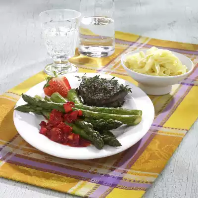 Add 5 tablespoons of water, season with salt and pepper. Cover and steam the asparagus for 5 minutes. Arrange medallion, asparagus and strawberry chutney on a plate. Garnish with strawberry and 1 stalk of thyme.