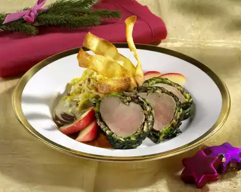 Take the fillet rolls out of the oven and cut them into slices. Serve with sauce, creamed savoy cabbage, apple slices and potato strips.