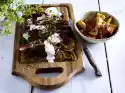 Fold down 6 tbsp. of oil. Mix with shallots, nuts and salads. Arrange everything and sprinkle the meat with the broth.