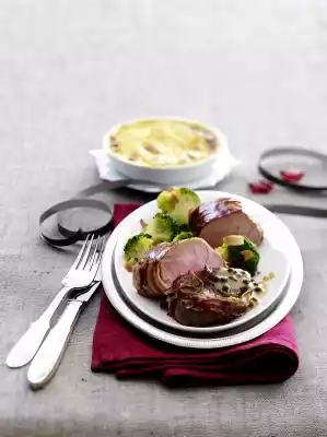 First fry pork fillets all around, then medallions on each side. Slide the pork fillet on baking paper on the grill over the gratin. Fry for about 20 minutes, medallions 10-15 minutes.