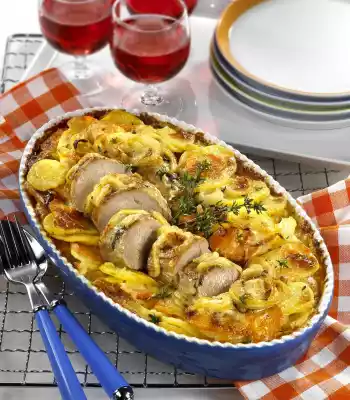 Slice or cut the potatoes and carrots into thin slices. Arrange with the fillets in a large greased casserole dish. Pour the onion cream over it. Bake in a hot oven (electric cooker: 200 °C/circulating air: 175 °C/gas: level 3) for about 1 1/4 hours