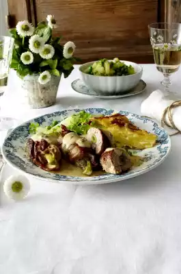 Stir the starch with a little water until smooth, thicken the sauce with it and season to taste. Remove gratin from the oven, cut rolls diagonally in half. Serve the rolls with sauce, vegetables and gratin. Garnish with chervil.