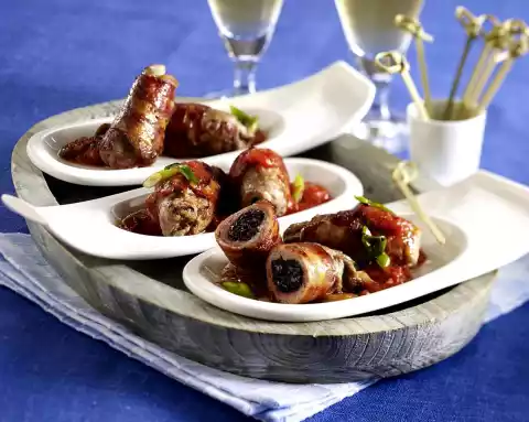 Season with salt and pepper. Place 1 plum on each slice of meat, roll up and wrap tightly with 1/2 slice of bacon. If necessary, pin with small skewers.