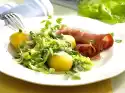 Wash the potatoes. Cook in water for about 20 minutes. Clean, wash and halve the beans. Cover and cook in little boiling salted water for about 15 minutes. Drain. Quench potatoes, peel and let cool down