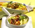 Wash the fillet, pat dry and cut into 16 medallions. Wrap each medallion with a slice of bacon. Clean, wash and cut the peppers into pieces. Peel 1 onion and cut into slices. Cut lemon into 4 pieces. Put 4 medallions, peppers and pieces of onion alternately on 4 skewers, finishing with 1 piece of lemon