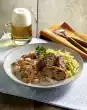 Heat 1-2 tablespoons of oil in a frying pan. Fry the skewers on all sides at medium heat for about 10 minutes. Season with salt and pepper. Stir mustard and sour cream until smooth. Season to taste with salt and pepper. Season the potato salad again and arrange it with the skewers. Put the mustard cream as a blob on top and garnish if necessary