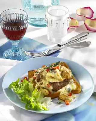Toast roasting. Dab the fillet dry. Fry in hot oil in a coated pan for 1-2 minutes on each side. Season and remove. Fry the mushrooms and onion in the frying fat for about 5 minutes, season