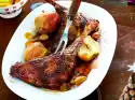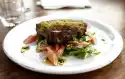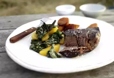 Arrange the steaks with the apple spinach. Garnish with long pepper if desired. Roast potatoes taste good with it.