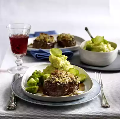 Squeeze out the mushrooms and chop very finely. For the crust mix mushrooms, bread crumbs, nuts and 75 g butter. Cover and cook potatoes and 250 g Brussels sprouts in boiling salted water for about 25 minutes. Cook the rest of the sprouts in boiling salted water for 18-20 minutes.