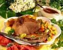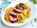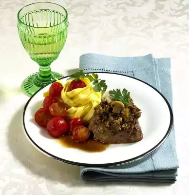 Season with salt and pepper. Set aside. Prepare the pasta in plenty of salted water according to the instructions on the packet. Halve the cherry tomatoes. Dab steaks dry and fry in hot clarified butter on each side for about 2 minutes.