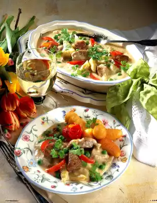 Wash the tomatoes, quarter them, remove the seeds and cut them into slices. Wash the tips of the fillet, dab dry and cut into small pieces. Peel onion and chop finely. Fry onion and meat in hot oil, turning. Deglaze with 3/4 litre asparagus stock and bring to the boil. Knead fat and flour and thicken the sauce. Warm the asparagus, peas and tomatoes. Whisk cream and egg yolk, stir into the ragout and do not let it boil. Season to taste with salt, pepper and lemon juice.