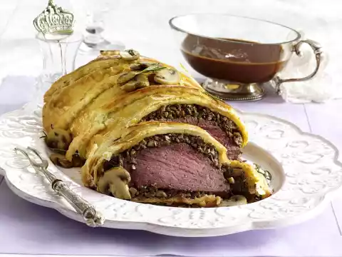Pour sauce through a sieve into a pot. Bring sauce to the boil again. Stir the starch with a little water until smooth, thicken the sauce with it until slightly creamy, bring to the boil again. Season to taste with salt and pepper. Remove the Wellington from the oven and let it rest for ten minutes.