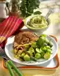 Cut the rest of the dough into strips and stick them on as decoration with egg white. Brush everything with whisked egg yolk. Place a cup of cold water on the baking tray. Bake in the preheated oven (electric oven: 200 °C/circulating air: 175 °C/gas: level 3) for approx. 25 minutes until golden brown
