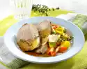 Heat 1 tsp. fat in the frying fat. Sauté the onion in it. Fry the sugar snap peas briefly. Season with salt, pepper and 1 pinch of sugar. Add 5-6 tablespoons of water and steam covered for about 5 minutes. Add tomatoes after 2-3 minutes and cook. Season vegetables to taste. Cut meat into slices. Serve with vegetables and rice