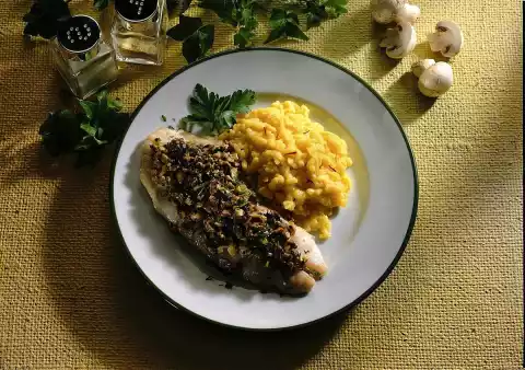 Let it cool down a little. Add the egg yolks and chopped herbs, except for a tablespoon, to the mushrooms. Place the fish fillets side by side in an ovenproof dish and spread the mushrooms on top. Bake in a preheated oven (electric: 200 °C/ gas: level 3) for approx. 12 minutes.