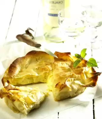 Stir the cheese into the sauce. Season to taste with pepper and nutmeg. Melt 80 g butter in a saucepan. Lay the filo pastry apart. Wrap the dough in a damp tea towel. Lightly spread 6 tartlet cups (each 11 cm Ø) with butter.