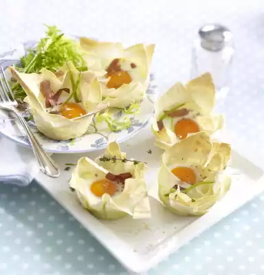 Mix about 1/3 of the pods with the ham. Spread the ham mixture into the baskets, except for about 2 tablespoons for sprinkling. Slide 1 egg each into the wells. Season with salt and pepper. Bake in the preheated oven (electric cooker: 200 °C/ convection oven: 175 °C/ gas: level 3) for 12-15 minutes until the egg has set and the dough is brown.
