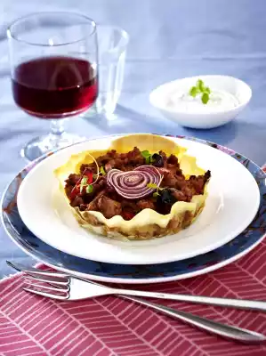Spread out the dough sheets and cut out 18 circles with a round cookie cutter (approx. 14 cm Ø). Place 3 dough circles slightly offset in 6 tartlets (10 cm Ø each). Stir the egg yolk and 1 tbsp. yoghurt into the minced meat mixture and distribute in the tartlets.