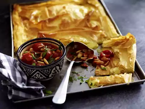 Let the dough sheets rest at room temperature for about 10 minutes. In the meantime peel onion and garlic. Roast the pine nuts in a pot and take them out. Heat the oil in a hot pot, fry the onion and garlic in it. Add tomato paste and sauté briefly. Add tomatoes, season with salt, pepper and sugar. Simmer at low heat for about 10 minutes
