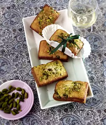 3 Preheat the oven to 180 °C (th 6). Divide the dough into slightly moist silicone financial moulds. Sprinkle the pistachios by pushing them a little. Bake for about 12 minutes. Turn out of the mold and let cool on a rack.