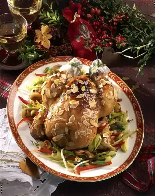 Steam for about 5 minutes. Add sweet and hot sauce, fold in mushrooms and bring to the boil. Season with salt and cayenne pepper. Fold in sprouts. Keep vegetables warm. Sprinkle chicken with almonds and sprinkle with remaining honey glaze.