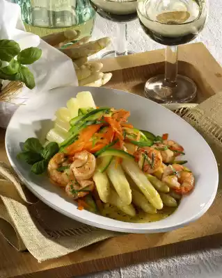 Cut the basil into strips and sprinkle on the prawns. Arrange asparagus with vegetables and prawns on a plate and garnish with the rest of the basil.