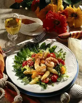 Wash and peel the asparagus and cut off the woody ends. Cut the asparagus into pieces. Clean and wash the mangetouts. Cook the asparagus in boiling, slightly salted water for about 10 minutes. Cook the pods for the last 3 minutes. Drain vegetables