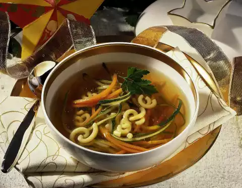 Heat the fat. Brown the onions and vegetables in it. Add 1 1/2 l hot water and bring to the boil. Stir in stock and cook everything for about 2 minutes. Heat up the pasta. Season stock, arrange and garnish with parsley
