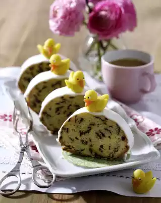 Bake the cake in a preheated oven (electric cooker: 175 °C/ convection oven: 150 °C/ gas: level 2) for 45-55 minutes. Remove the cake from the oven, allow to cool for 15 minutes, then turn out onto a cake rack. Knead marzipan and 2 tablespoons of icing sugar and colour yellow. Take off 1 scarce teaspoon of marzipan and colour it orange with red colour. From the remaining marzipan, form 12 balls of approx. 10 g each. Form small chicks from each ball, using the orange marzipan as beak. Mix egg white and 175 g icing sugar. If the icing is too thick, add some lemon juice. Cover the cake on the cake rack with the icing and let it dry for 2-3 hours.