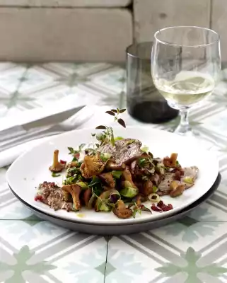 Heat 1 tablespoon of oil in the large cast-iron pan. Fry the fillet slices in it in portions over high heat for 10 seconds on each side. Season with salt and pepper. Add mushrooms and mix everything.