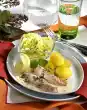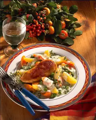 Dab the fillet dry. Fry in oil for about 10 minutes, season. Add milk to the vegetables, bring to the boil and thicken. Stir in cress, season to taste