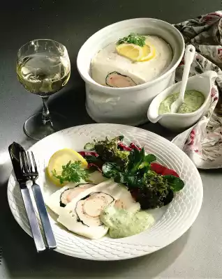 Season to taste with salt, pepper and a little lemon juice. Let the terrine cool down a little, cut it warm and serve with herb cream.