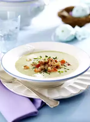 Finely puree the soup. Stir in cream and season to taste with salt, pepper and sugar. Add shrimps, diced tomatoes and about 2/3 of the herbs to the soup, bring to the boil briefly. Arrange the soup, sprinkle with the remaining herbs