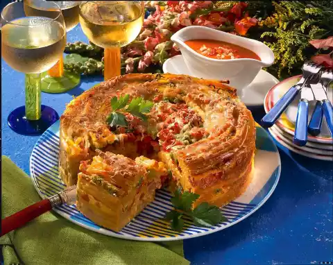 Let it boil for 1 minute. Add cream and season to taste with salt, pepper and paprika powder. Carefully remove the macaroni cake from the pan and arrange on a large plate. Serve garnished with parsley.