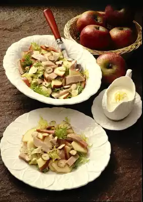 Clean, wash and pluck the frisée salad. Mix the meat, apples, lettuce and hazelnuts and place in a bowl. Squeeze the second lemon. Mix sour cream with mayonnaise and season to taste with lemon juice, salt, pepper and sugar.