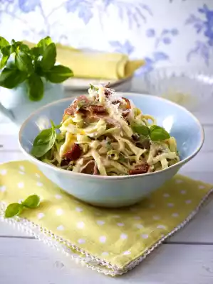 Wash the basil and cut into strips. Drain the pasta, drain and mix with the sauce. Serve, sprinkle with the rest of parmesan and garnish with the rest of the basil