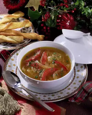 In the meantime, clean, wash, quarter, seed and cut the tomato into thin slices. Heat the tomato slices briefly in the soup. Season to taste with salt and pepper. Wash parsley and chop finely. Fill onion soup into soup bowls and serve sprinkled with parsley