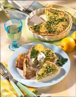 Grease a quiche or springform pan (approx. 24 cm Ø). Roll out the short pastry round (approx. 28 cm Ø) on a little flour. Line the mould with it, prick it more often with a fork. Spread the peas on top. Mix sour cream and 2 eggs. Season with salt, pepper and nutmeg. Pour over the peas. Bake in the preheated oven (electric cooker: 200 °C/ convection oven: 175 °C/gas: level 3) for approx. 45 minutes