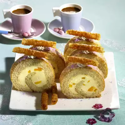 Spread the cream on the sponge cake. Sprinkle with peach cubes, press on a little. Roll up the sponge cake from the long side, chill for approx. 1 hour. Melt 35 g butter. Mix 25 g flour, 50 g sugar and honey. Allow the mixture to thicken a little. Spread 1/2 teaspoon of the mixture at large intervals on a baking tray lined with baking paper. (Approx. 8 pieces fit on a baking tray!) Bake in a preheated oven (electric cooker: 175 °C/ convection oven: 150 °C/ gas: level 2) for approx. 5 minutes until golden brown. The mixture melts into circles. Circles must be completely coloured. Leave to rest for 2-3 minutes, remove from baking paper and form into rolls. Cut the sponge roll into slices. Serve decorated with lilac sugar, cream pats and caramel rolls