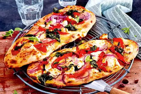 Quarter the dough and roll each portion out oval on some flour. Place the flat cakes on two baking trays lined with baking paper and spread with crème fraîche. Cover with paprika, onions and spinach. Crumble feta over it. Bake one after the other in a preheated oven (electric cooker: 230 °C/circulating air: 210 °C/gas: see manufacturer) for about 15 minutes.
